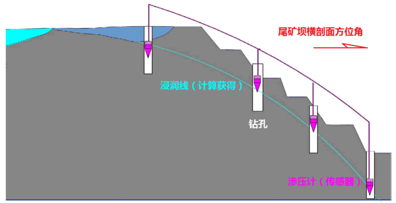 浸润线监测,浸润线是尾矿坝安全的生命线,浸润线的高度直接关系到坝体稳定及安全性状,当浸润线埋深为0m,可产生管涌,是直接导致溃坝的原因。因此,对于浸润线位置的监测是尾矿库安全监测的重要内容之一。