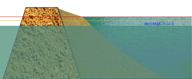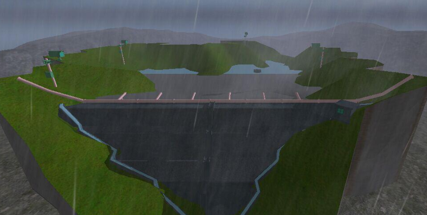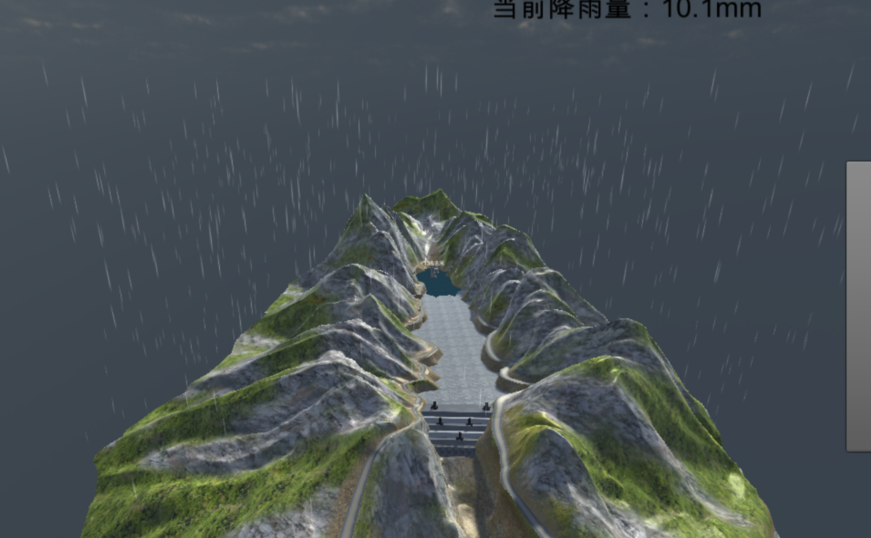 我方采用三维界面,通过提供的尾矿库地形图,构建尾矿库三维模型,尾矿库在线监测首页即为三维真实展示,根据监测的数据,动态演示尾矿库情况,例如会根据天气情况模拟降雨和晴天效果等。