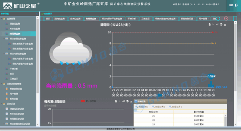 降雨量监测,库水位的高低,与排放的尾矿浆沉淀水有关,与水库排水系统有关,也与库区降水量有关,因此,降水量也是尾矿库监测的一个重要指标。