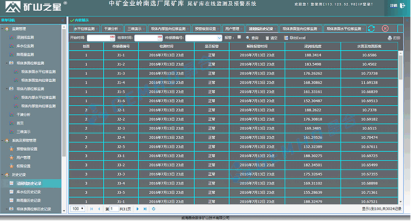系统通过各种物联网监测设备实现尾矿库系统额全方位安全监测,实时上报尾矿库现场情况,其中浸润线监测设备主要是水压力计、库水位监测主要是电子水位计、降雨量监测通过雨量计、干滩监测通过热像技术、双目视觉技术、摄影测量技术等监测、坝体内外位移通过水平位移、竖向位移的测斜仪和沉降仪进行测量。