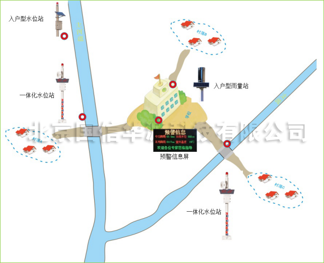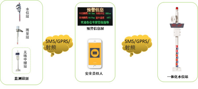 该系统由入户型简易雨量站、入户型简易水位站、无线中继站(根据需要)、一体化水位站、预警信息屏、手机组成。