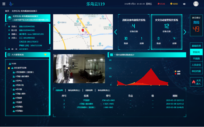 平台包含实时监控: 通过视频采集装置,实时监控消防通道情况,发现异常,及时作出处理;图像智能识别: 当消防通道堵塞或是人员密度较大时,会通过图像智能识别发出报警,使相关人员作出正确反应;报警受理: 异常报警信息会同时推送至云平台,监控中心提供24小时报警受理服务,第一时间通过电话、短信或手机App通知相关责任人员响应和处理;数据分析: 云平台运用大数据分析技术,实现消防分析图表的直观展示、消防火灾故障的本质挖掘和消防态势的准确研判。