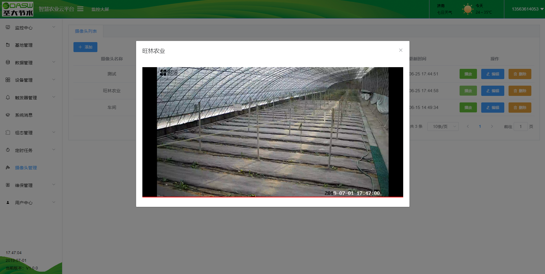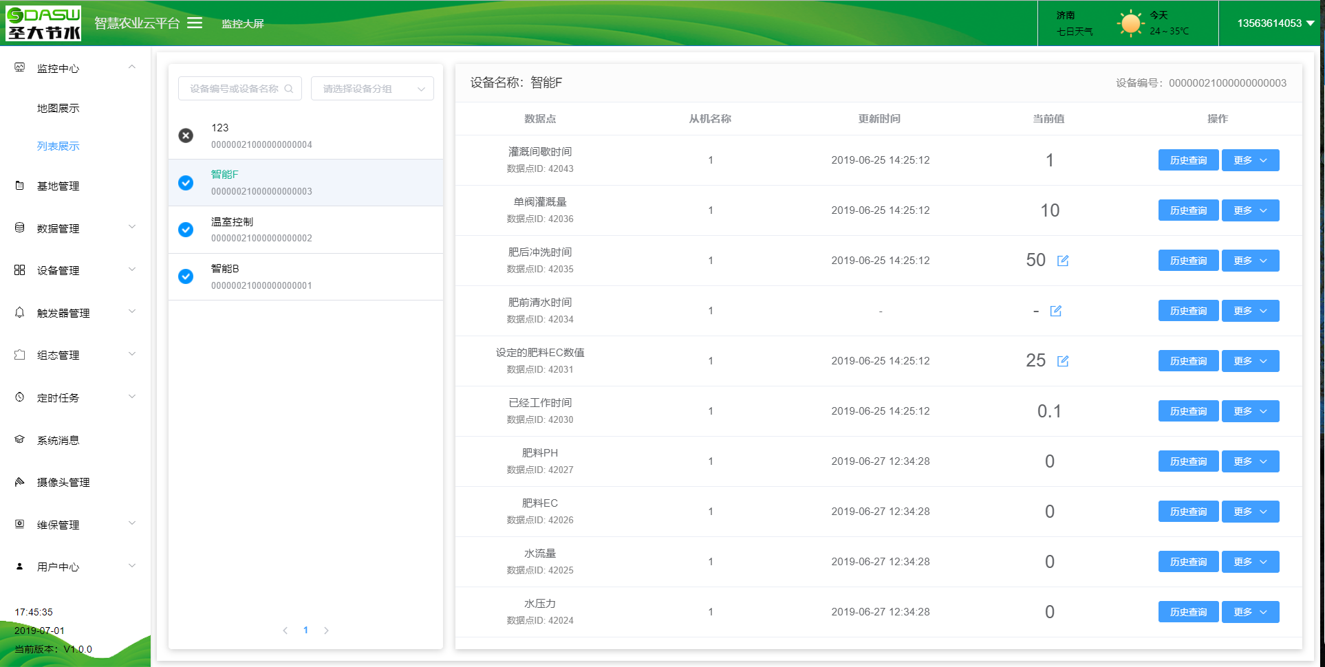 智慧农业云平台包含监控中心,基地管理,数据管理,设备管理,系统消息,摄像头管理,维保管理及用户中心等功能,可以通过监控大屏查看数据,控制水肥一体机,查看基地监控视频等。也可以在后台进行数据查看,历史数据展示,摄像头管理及查看,设备维护等功能。用户可以通过远程控制水肥一体系统,也可通过本地的人机交互界面进行本地控制。