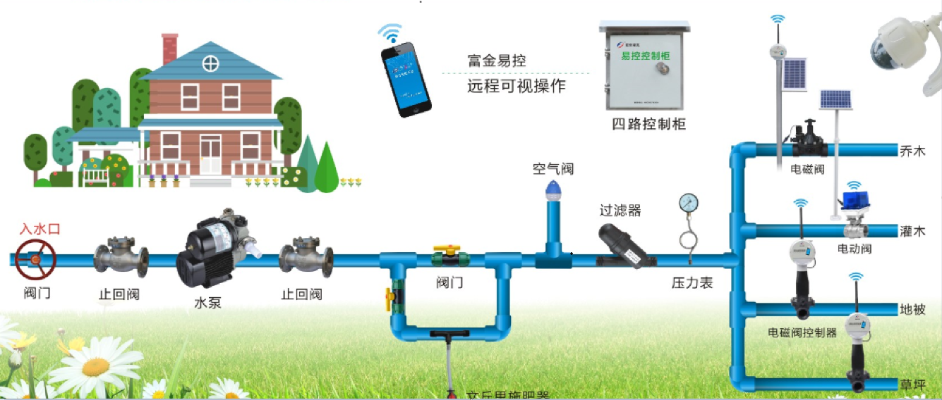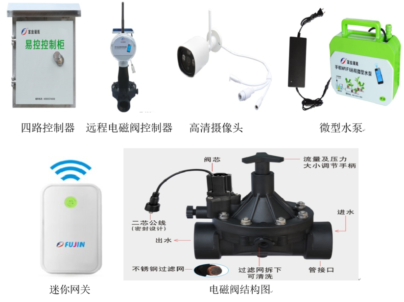 该系统用到的主要监测设备主要有土壤温湿度、压力传感器等以及高清摄像头实现对花园、菜园的数据采集,通过智能网关和四路控制柜实现对电磁阀、水泵的控制。
