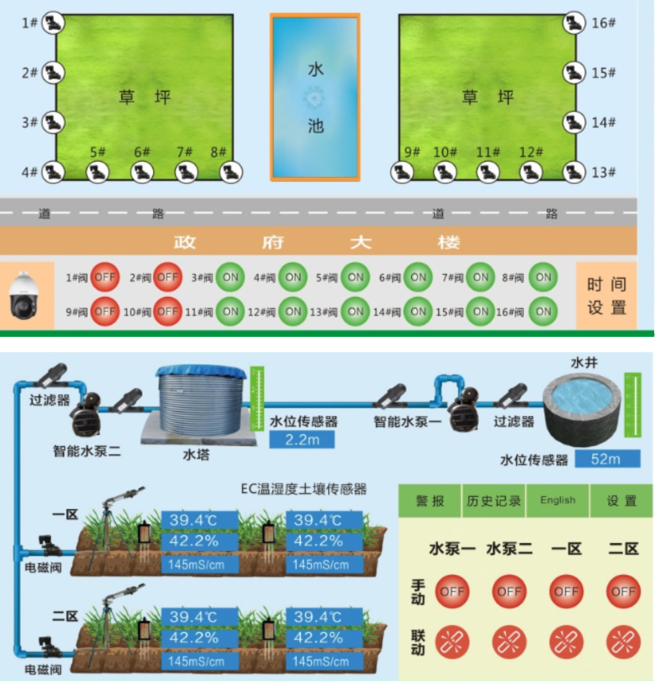 通过监控平台可实时查询草坪、花园、菜园的环境、土壤温湿度状况,并能查询相应的历史数据和管道结构图,点击相应按钮实现对灌溉、施肥等功能的控制。