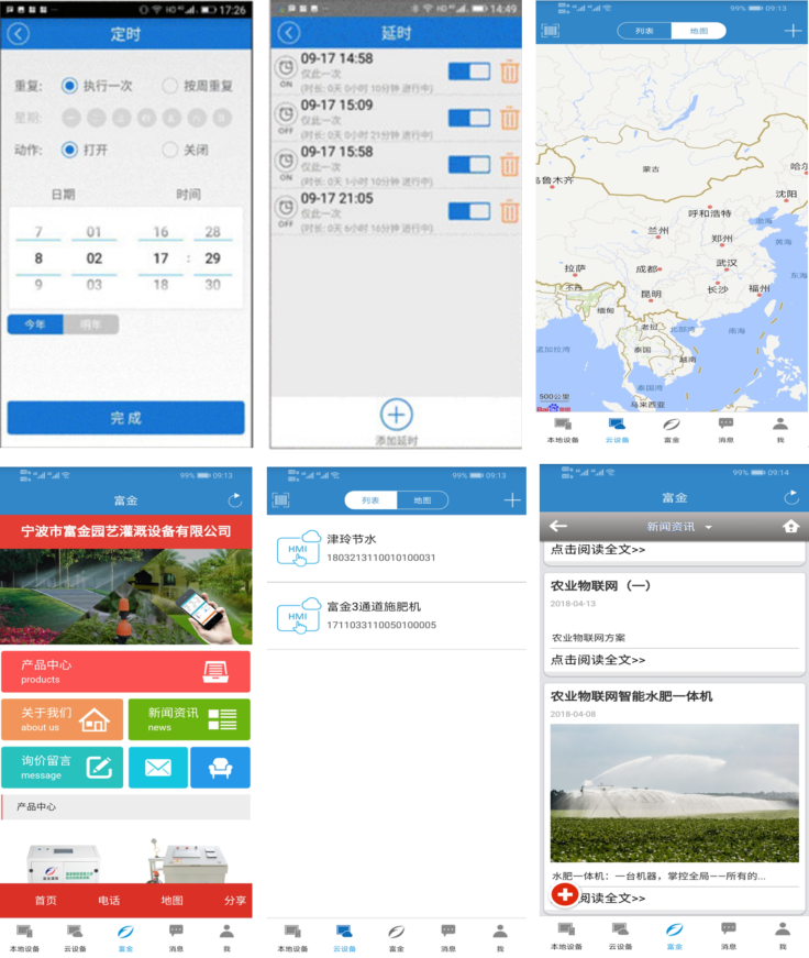 通过手机APP可实时查看各场地的环境信息,以及设备所在场地;还可实现对草坪、花园等地的定时灌溉和自动灌溉功能;APP能够实时推送相关案例新闻以及相关智慧农业设备,为客户农业建设提供方向。