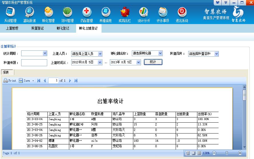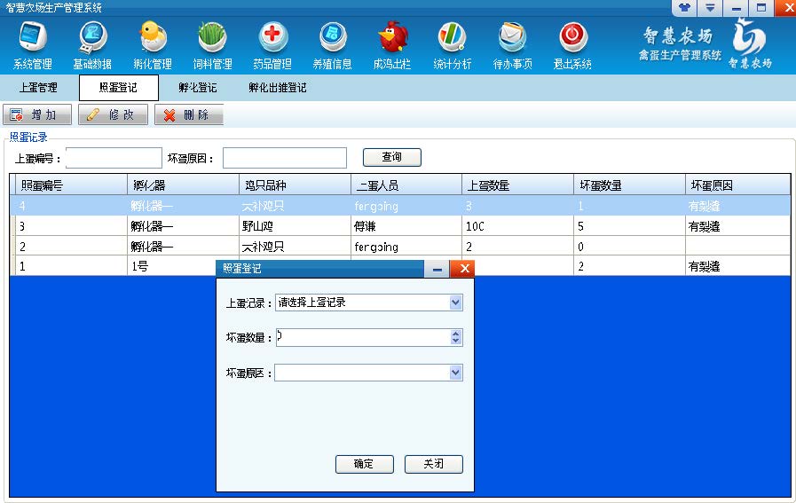 通过该软件平台可实时查看各个孵化器内禽蛋情况,包括种类、数量等,并对“坏蛋”数量进行实时登记,并记录“坏蛋详情”,同时通过该软件平台还可实现对家禽的饲料管理、药品管理,以及成禽出栏等信心管理功能。