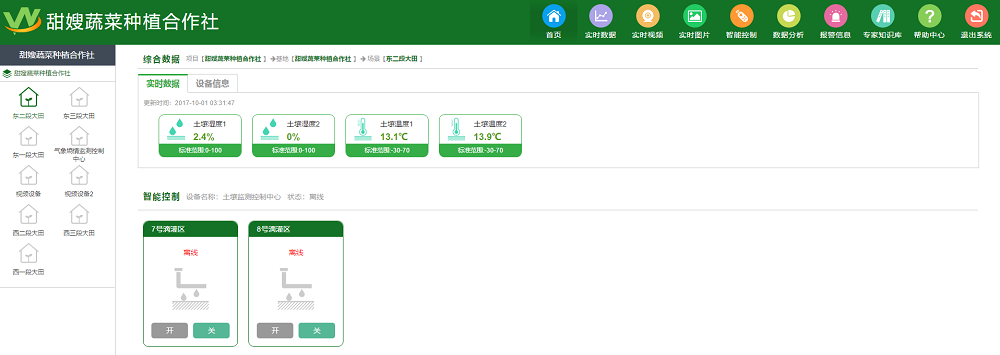 整个系统包括可以采集并展示采集数据,可以实时查看视频数据,来判断农作物生长情况,查看图像信息来查看农作物病虫害情况,可以连接后台专家系统,让相应的专家来查看,并发布指导信息。