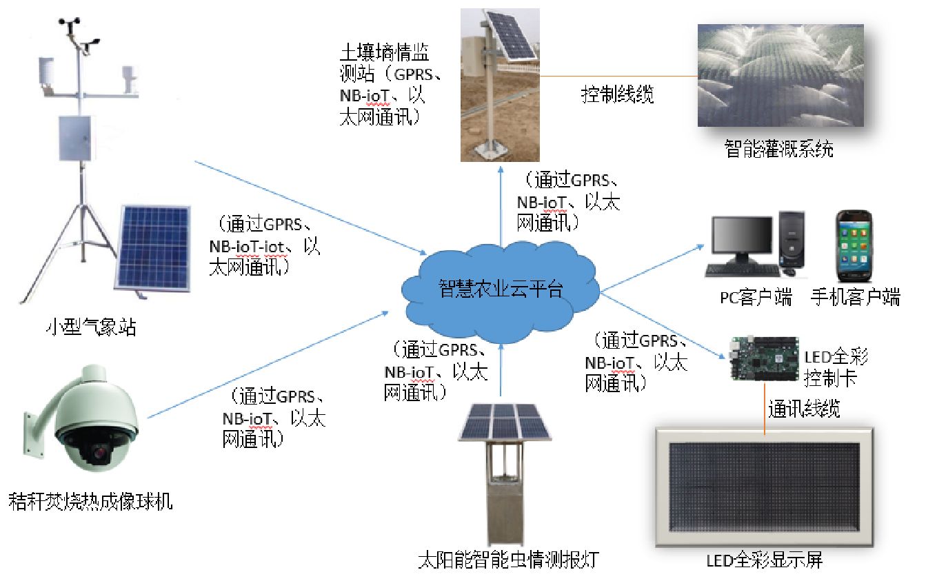 整套系统涉及传感器比较多,这些传感器主要采集土壤水分数据、空气温湿度、光照强度、风速风向、降雨量和蒸发量等,然后通过传输设备(有线方式或无线方式)将数据传送到管理平台,通过对数据的处理来反向指导农作物生产。