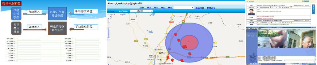 在系统中设置“四情”危害发生程度的安全值域,当监测到的数据超出安全范围时,报警系统启动,管理平台上的参数将会实时显示,并将危害状况以短信的方式通知用户。该系统将病虫害防治专家信息及联系方式全部集中到一起,用户可联线专家咨询“四情”危害防治难题,亦可将自己的防控经验分享到系统中,向农户提供在线指导和病虫害远程诊断服务,农户也可以通过平台进行在线咨询。