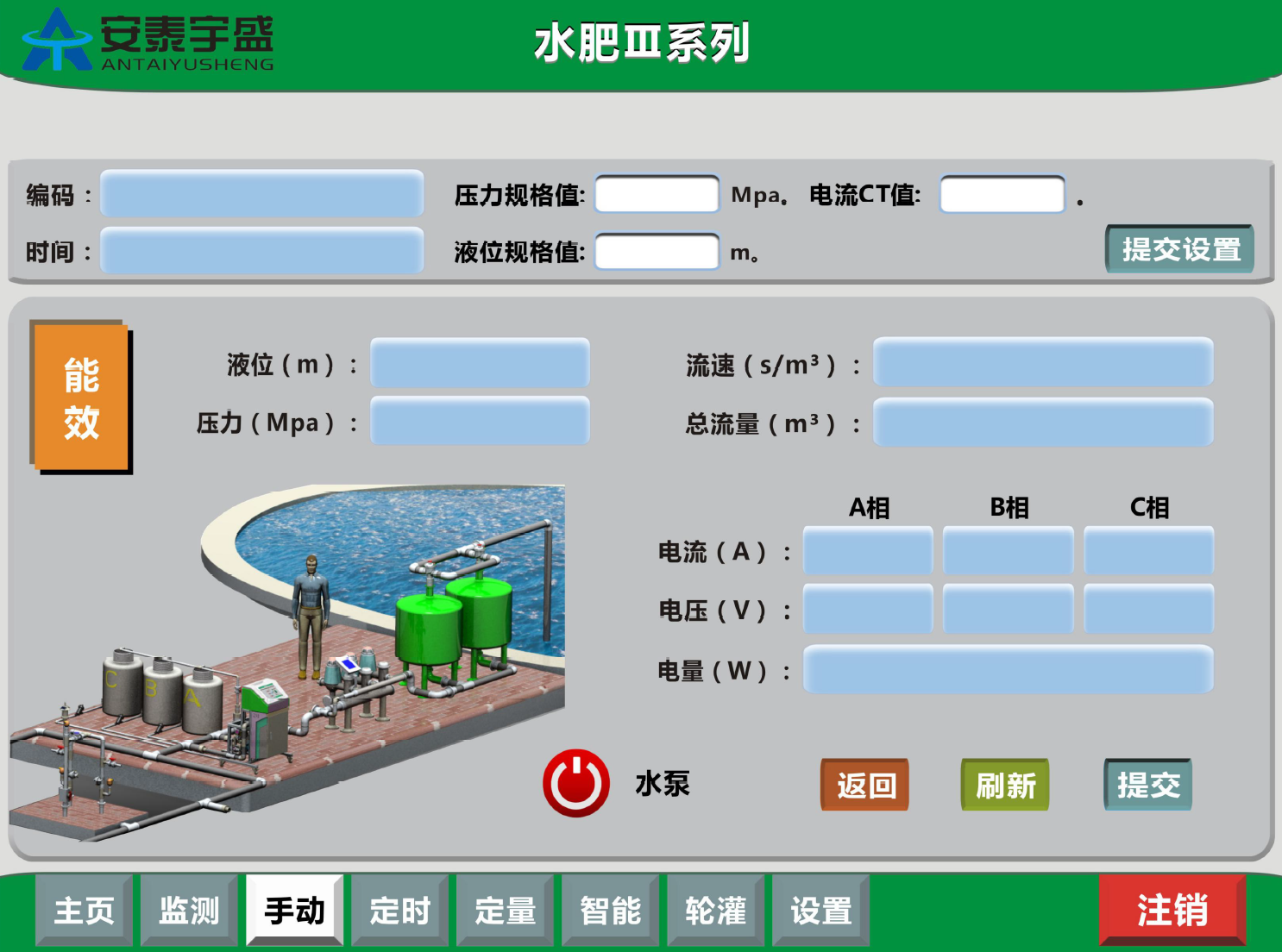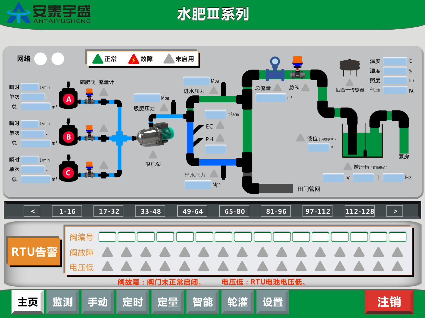 安泰宇盛水肥管理系统-水肥Ⅲ系列,采用中文人机运行操控界面,操作直观简洁,功能强大,智能化程度高,可满足不同灌溉水源及不同灌溉条件的要求。由农业云物联APP、农业云物联平台、嵌入式程序、水肥机、田间RTU、田间阀门、各类传感器、肥料贮液桶及输送管路等构成。具有节水60%、节肥50%、增产30%、环保、省人力等优点。
