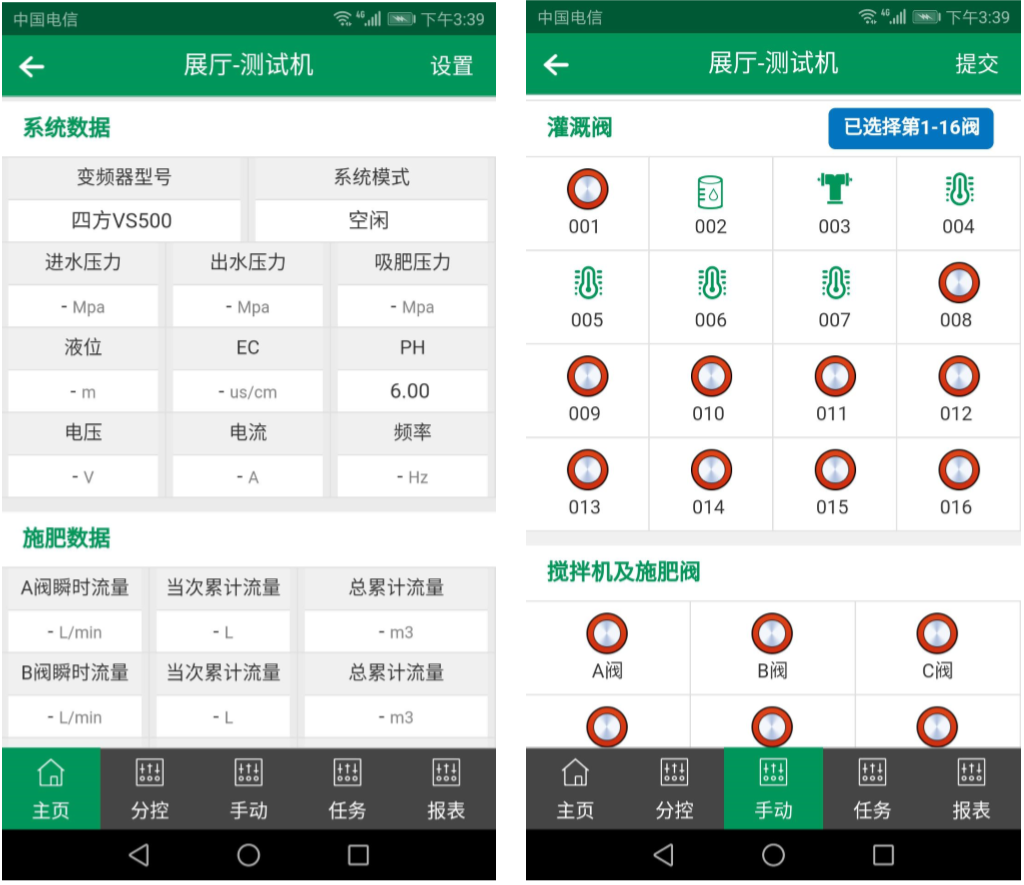 系统采用15寸触摸组态显示屏,模块化施肥灌溉控制器,完整实现人机界面显示,数据采集存储、设备控制、远程访问等功能。