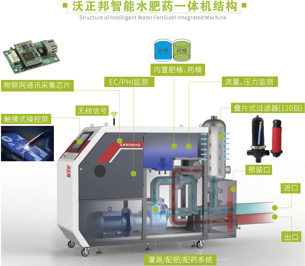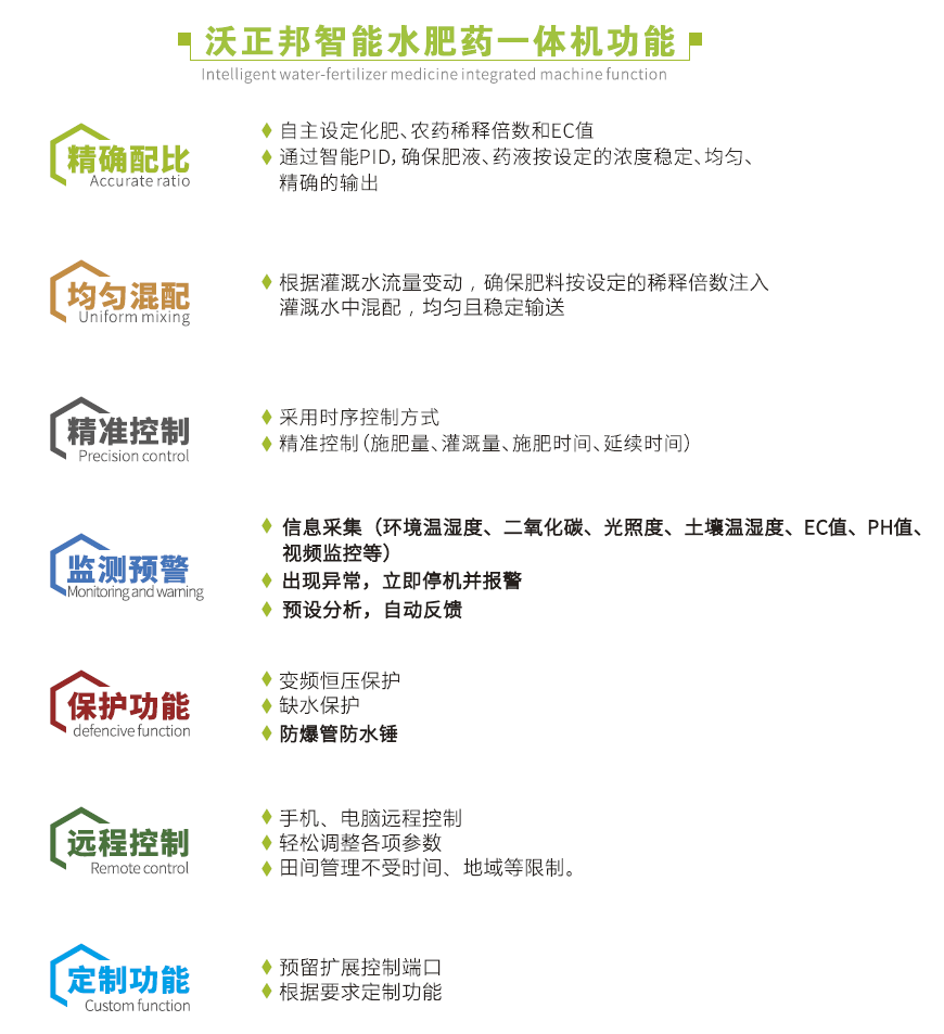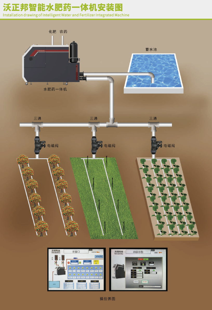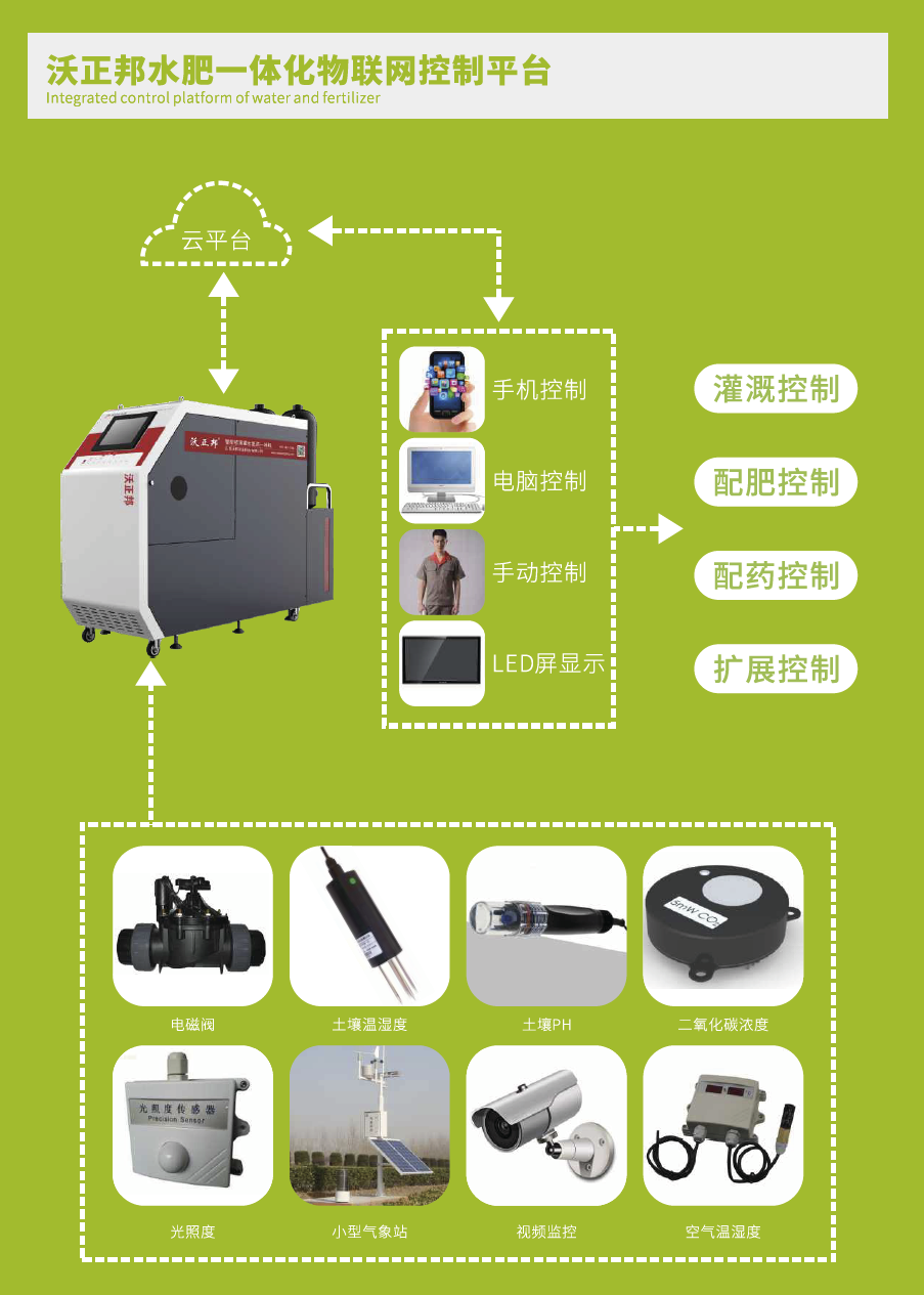 我司农业生产的水肥一体化设备,搭载自主研发的芯片,利用程序对灌溉、配肥、配药等操作进行集中控制;同时结合各传感器的数据分析,科学合理的安排灌溉施肥计划。通过电脑端和手机端的远程控制,实现精确稳定控制灌水量、施肥浓度和施肥量、喷药浓度和喷药量的目的。