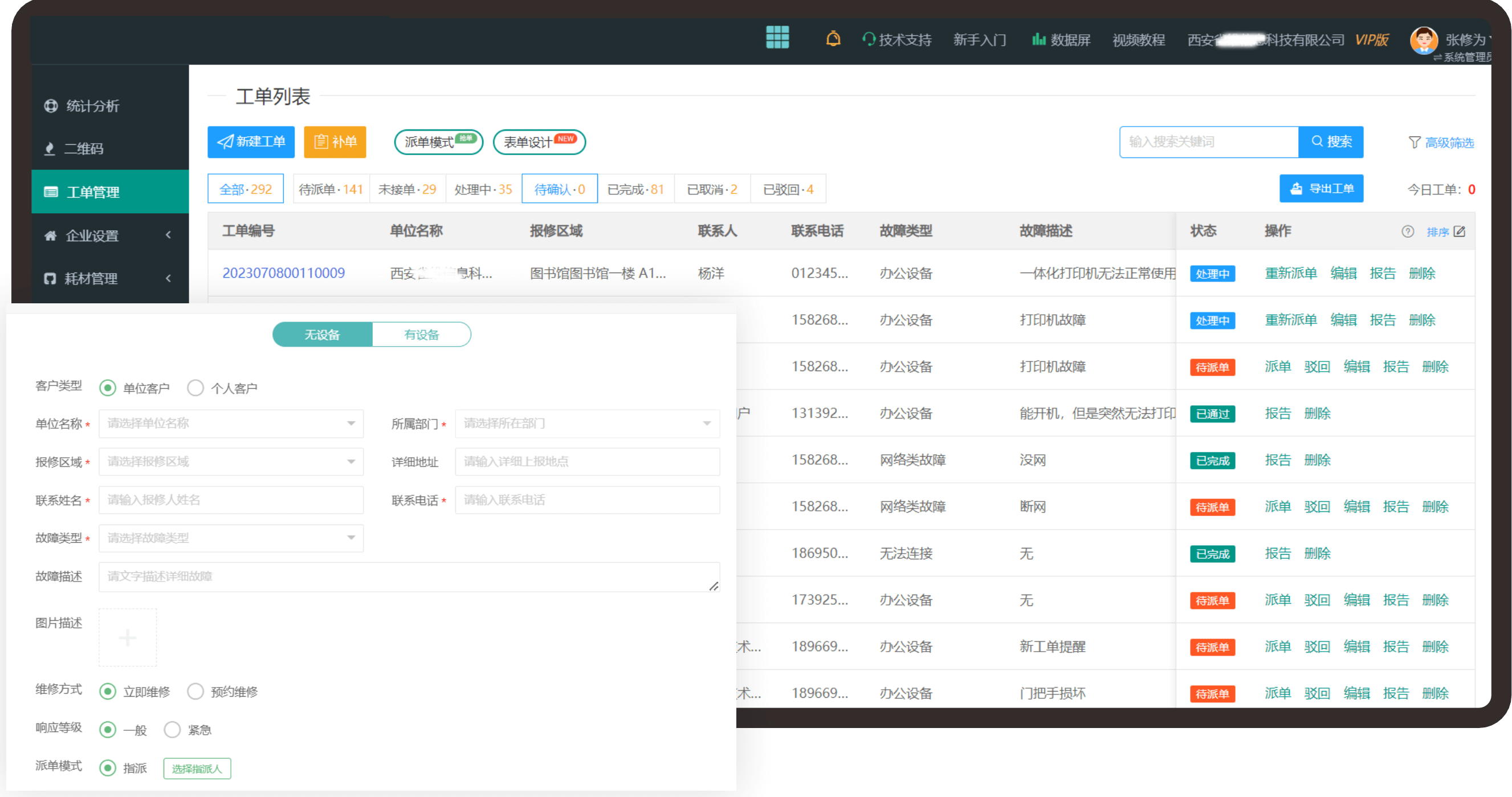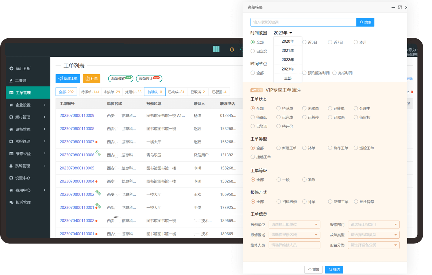 多维度维修统计分析及年报 丰富的工单数据报表,全方位展现报修情况 维修年报 自动生成单位全年维修报告,支持下载各类维修报表,用于年终总结、工作汇报。 工单管理灵活高效 实时收集分析数据,工单情况尽在掌握 新建工单 管理员可在后台创建新工单并指派给相关技术员,多用于临时产生的报修工单。 高级筛选 通过时间范围、工单状态/类型/等级等条件快速过滤出所需工单。 报修表单设计 根据企业需求自定义设置报修表单,包括单位码...