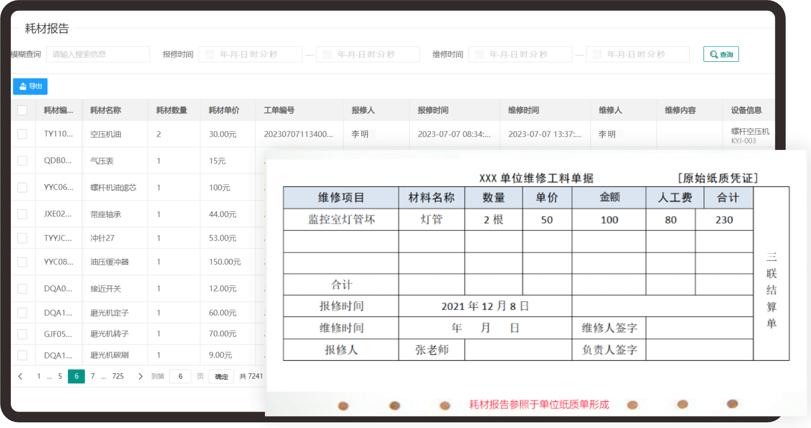 技术员维修完成后需要在工单中关联用到的耗材,同步生成详细的耗材报告,便于单位追溯耗材用量及核算成本。