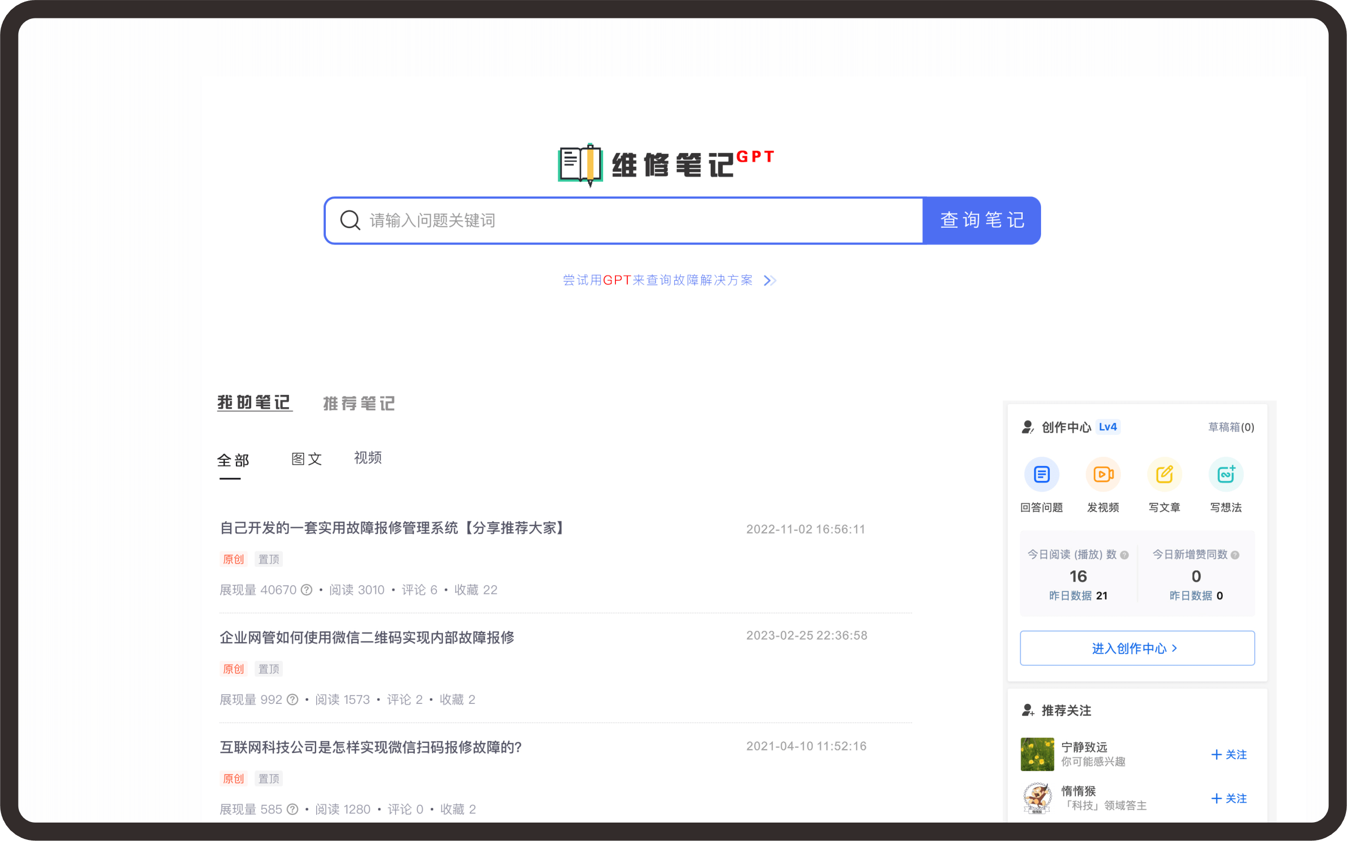 单位内部维修知识库,用户故障报修解决方案查询,维修员维修经验存档,实现单位内部维修经验共享学习。