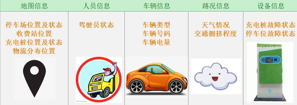 智慧交通的数据由地图信息、人员信息、车辆信息、路况信息、设备信息等组成。地图信息记录驾驶过程中路过的收费站、充电桩等。人员信息实时监控驾驶员的状态,实时警报,降低安全事故。车辆信息由车辆号码、位置、电量的多少等,路况信息包含天气情况、交通拥挤程度等,设备信息包含充电桩和停车点是否存在故障需要及时修理。