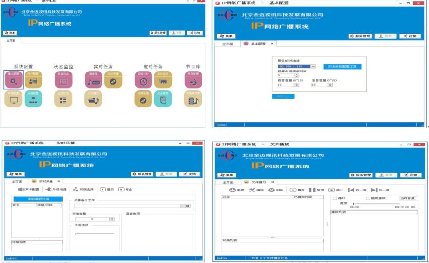 通过IP网络广播系统可实现对设备的状态监控、对设备的分组管理与配置(音量控制等);还可进行定时任务包括定时打铃、定时任务、定时采波;另外还可进行播音控制,进行实时采波、查阅媒体数据库音频等功能。