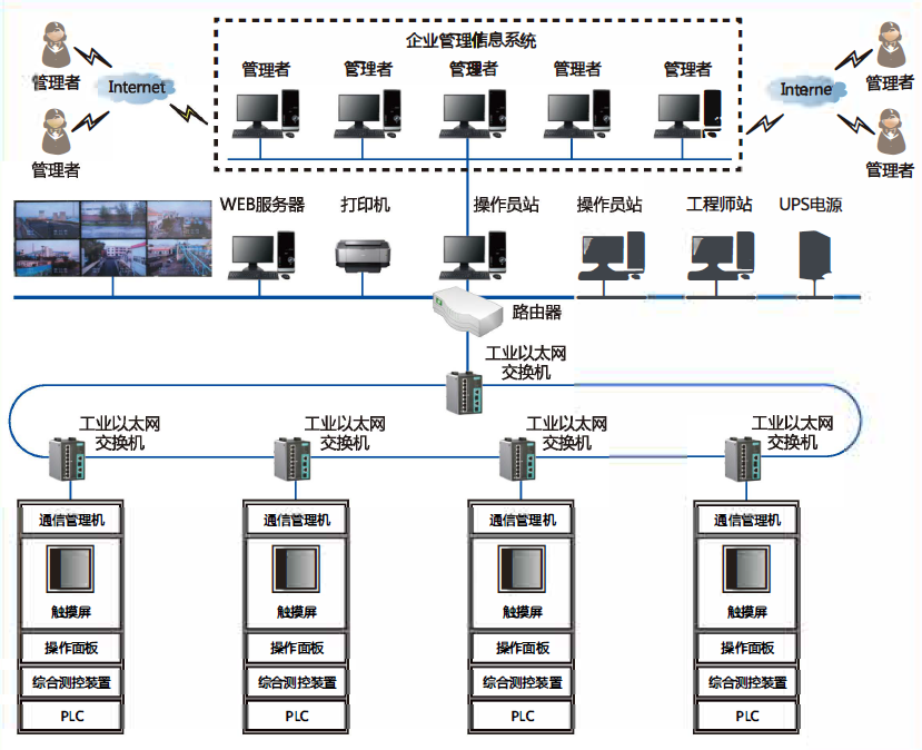 由监控中心的工程师站、历史数据服务器,通讯服务器,Web/MIS服务器,干兆以太网交换及大屏幕显示屏等监控操作设备及局域网组成。实时展示整个污水处理工艺流程中的各项参数,各设备运行状态,可自动控制,亦可手动操作。