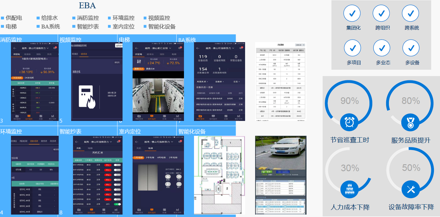 智慧楼宇管理系统一个平台实现了不同类型的设备接入与集中管控,实现了楼宇系统的集团化、跨组织、跨系统、多项目、多设备管理;有效节省了巡查工时,降低了人力成本,降低了设备的故障率、提高了服务质量。该系统由供配电系统、给排水系统、消防监控系统、环境监控系统、视频监控系统、BA系统、智能抄表系统等十大子系统组成。